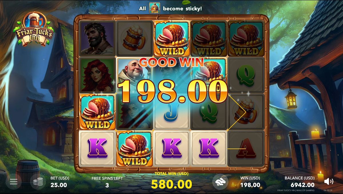 What makes Friar Tuck’s Inn truly engaging is how it plays with pace and control. The Free Spins feature is at the heart of the action — triggered by three Scatter symbols, it unlocks 10 Free Spins where all Wilds become sticky. Once locked, these Wilds remain on the reels until the end of the bonus round, giving each additional spin greater potential for high-paying combinations.