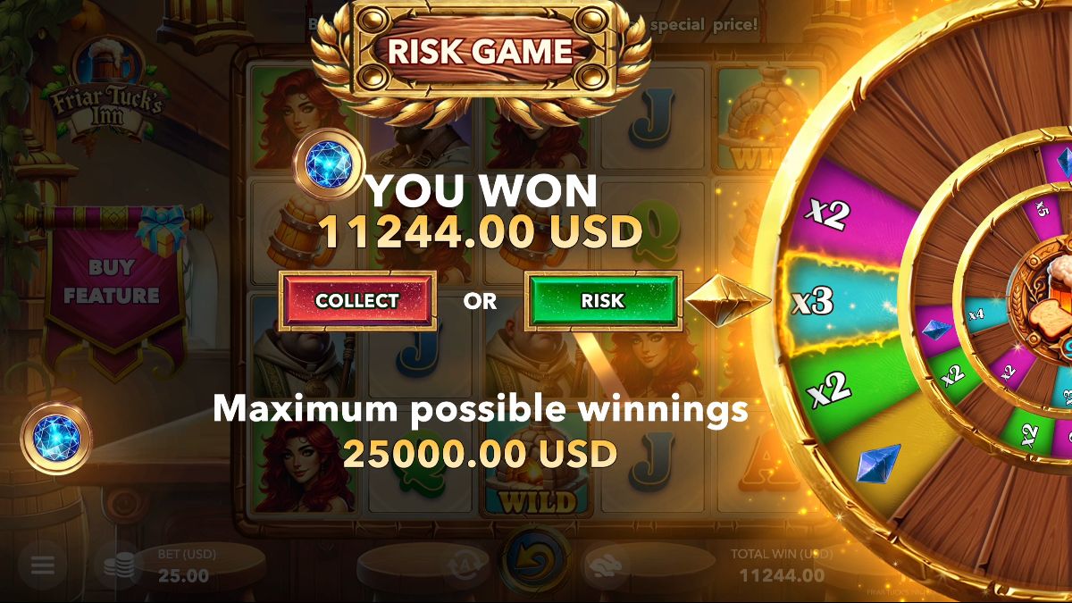 Friar Tuck’s Inn is built on a 5-reel, 4-row layout with 25 paylines and a medium volatility. The HIT rate of 45.83% promises frequent action, while the maximum win of x1000 the bet adds just enough tension to keep things interesting. The game is fast-loading, clean in performance, and optimized for both desktop and mobile platforms.