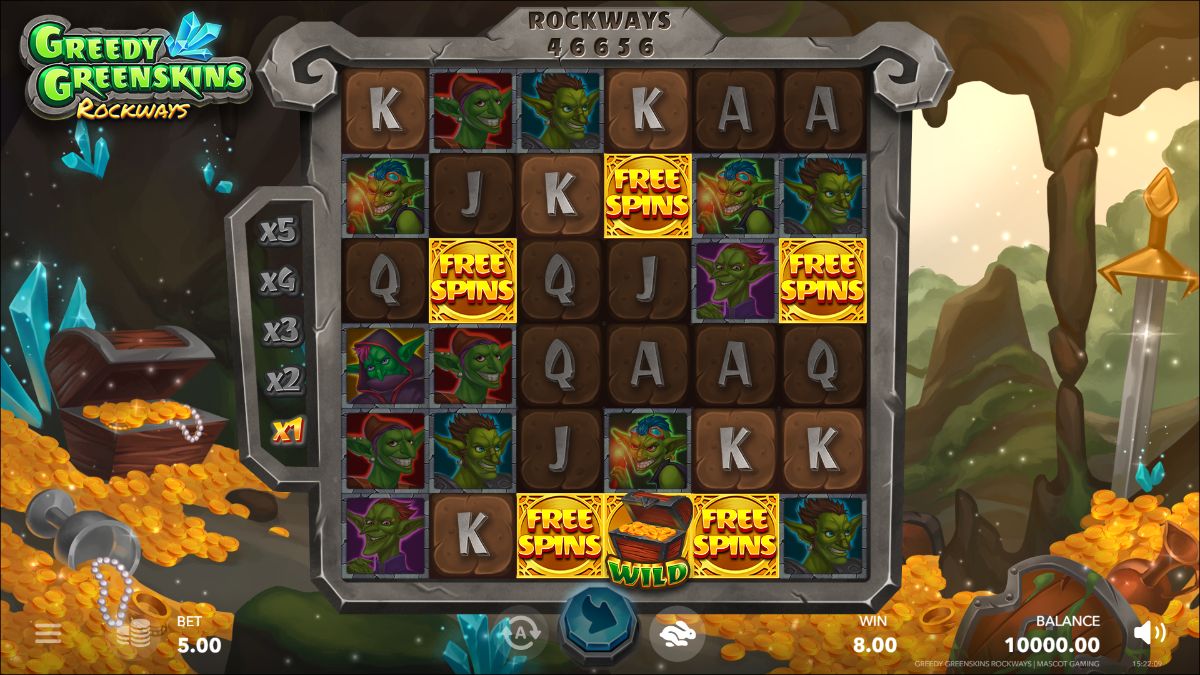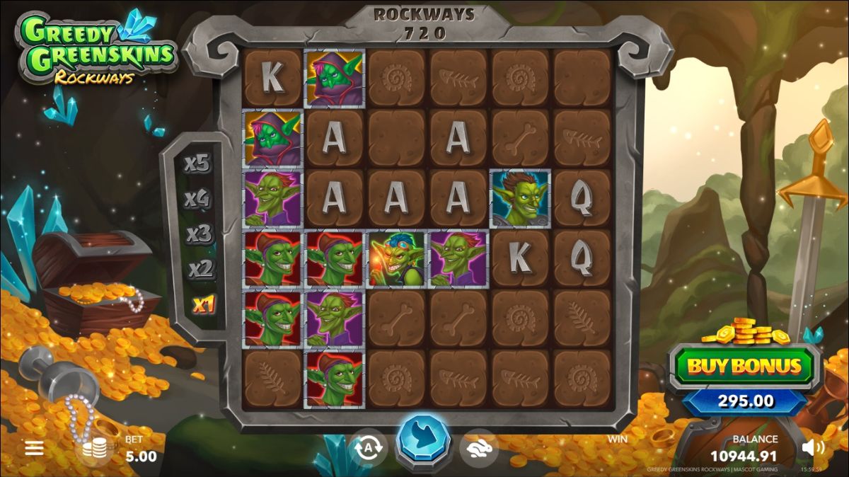 Greedy Greenskins Rockways is another fantasy-based slot in the Rockway series of Mascot Gaming. And yet, it pushes the boat out into deeper waters, utilizing a more imaginative theme pairing the Rockways mechanic with intriguing Rockfall and Risk & Buy features.